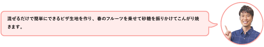 - それぞれのピザ生地の上に混ぜ合わせたチーズクリームを半量ずつ塗り、フルーツを好きなように盛る。上白糖を小さじ1ほどずつふって200度のオーブンで12分ほど焼く。取り出して粉砂糖をふり、チャービルを添える。