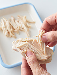 電子レンジ(600W)に1分30秒間かけ、裏返して1分30秒間かけ、粗熱がとれるまでおき、細く裂く。