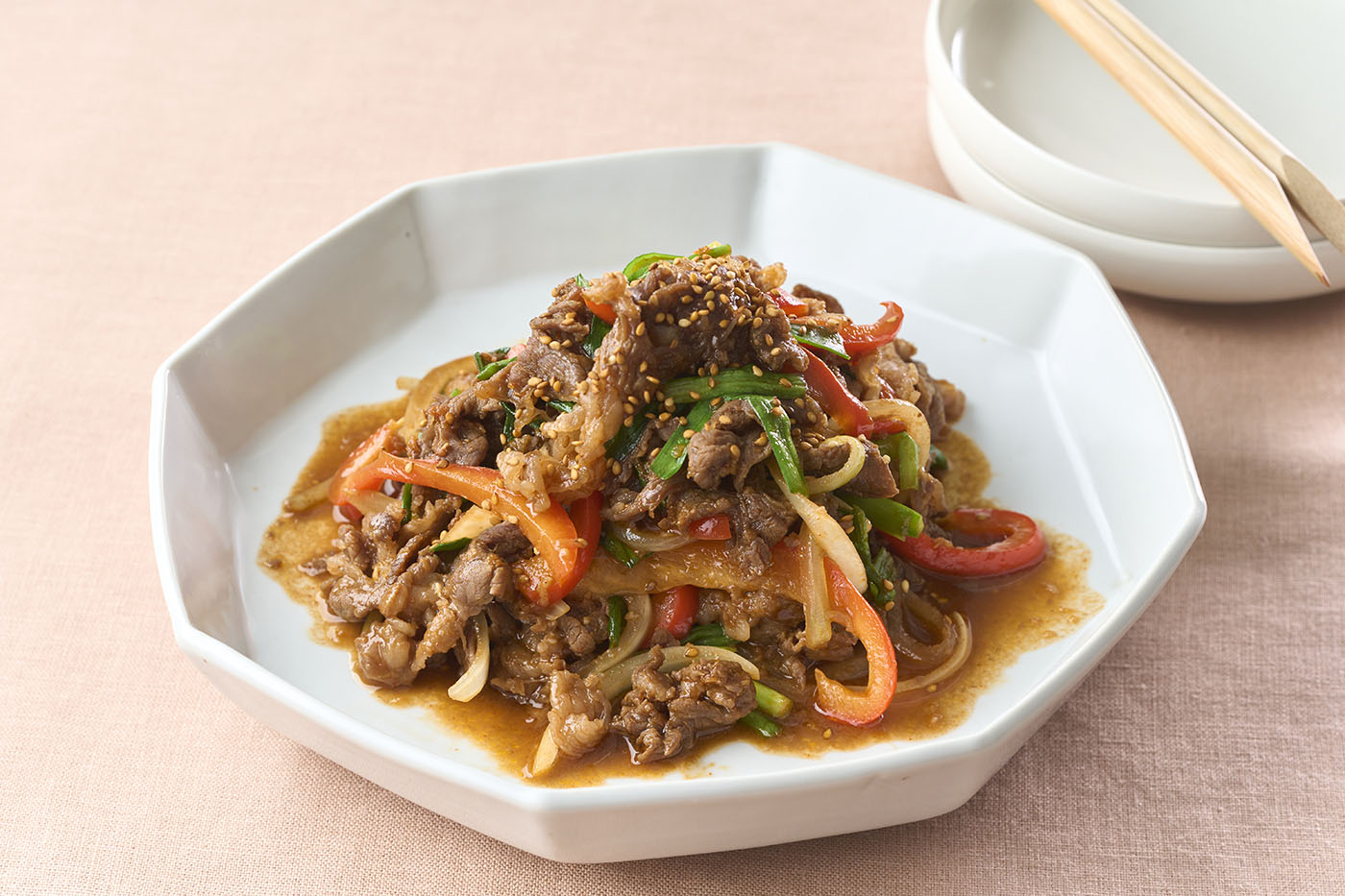 Bを端に寄せ、牛肉の上下を返して「サッと使える砂糖」小さじ1程度と残りのAをかけ、電子レンジに2分間かける。