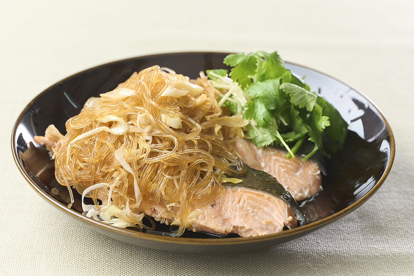 鮭に塩をふる。春雨は水にくぐらせて耐熱皿に広げ、ねぎ、鮭をのせる。